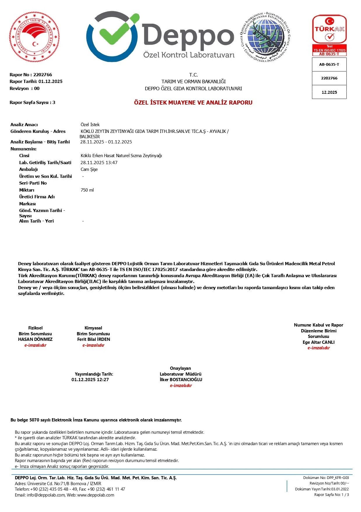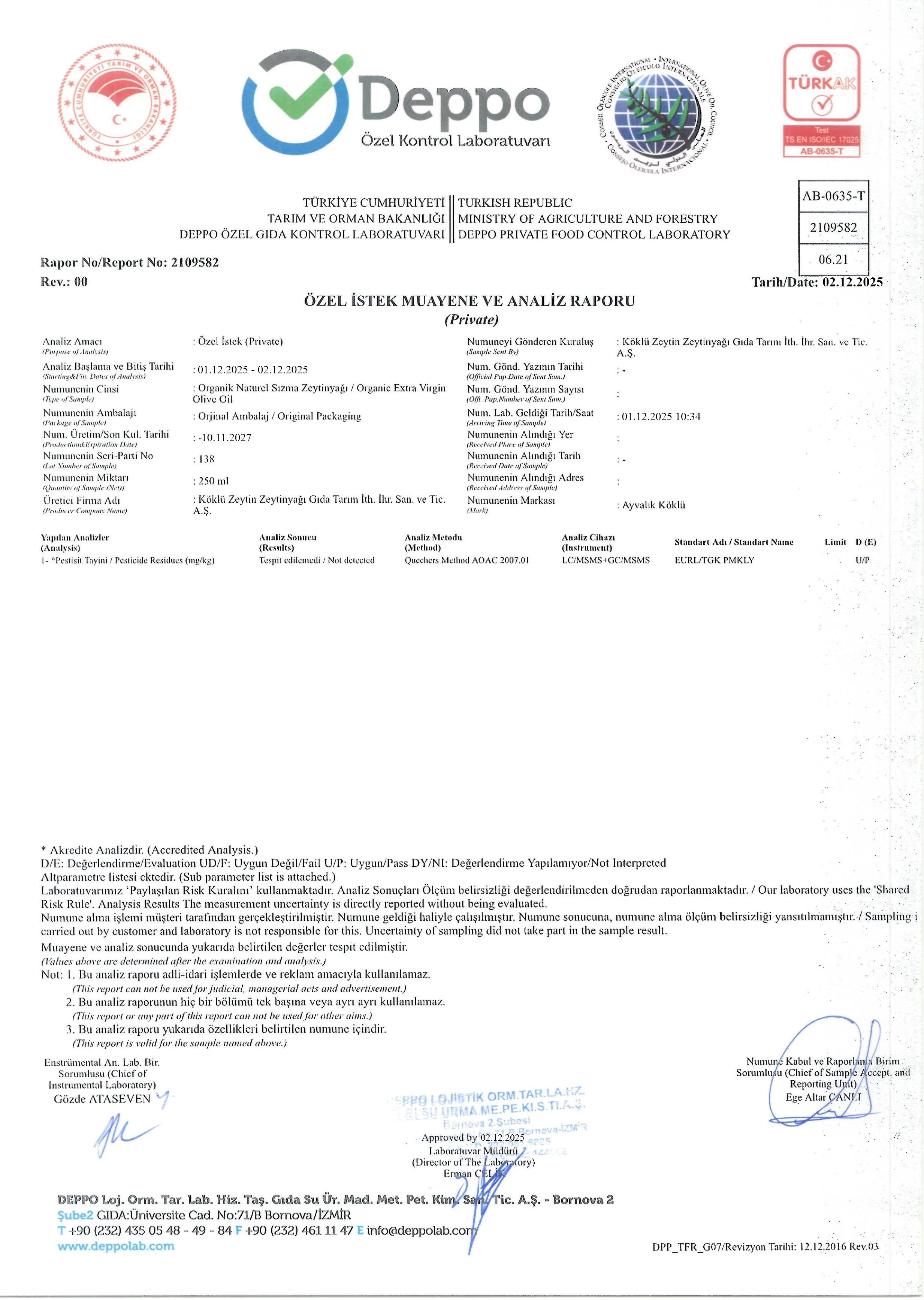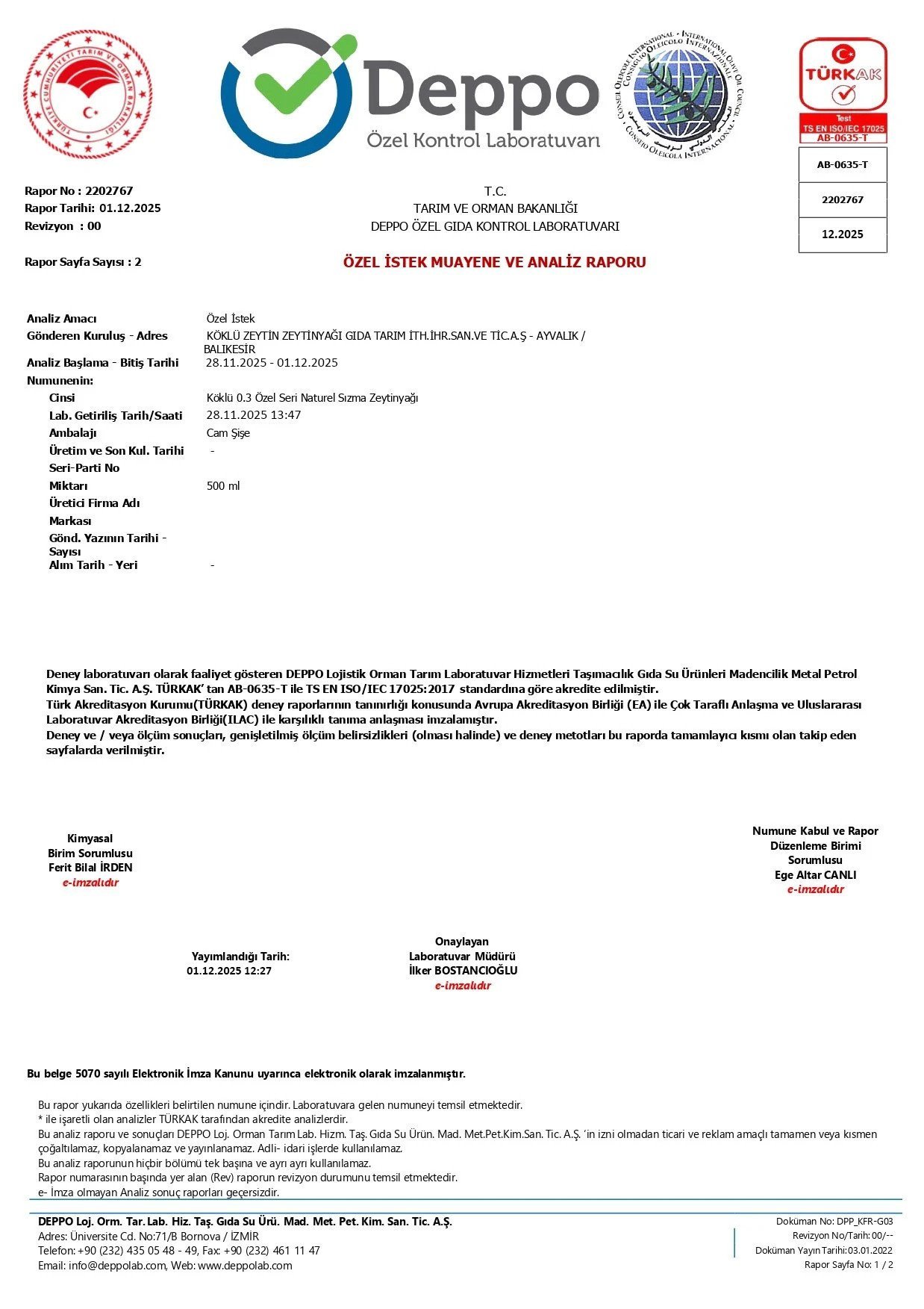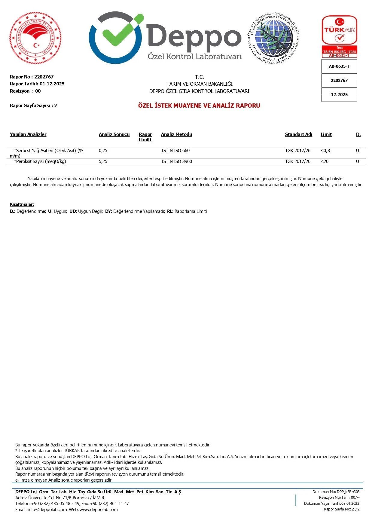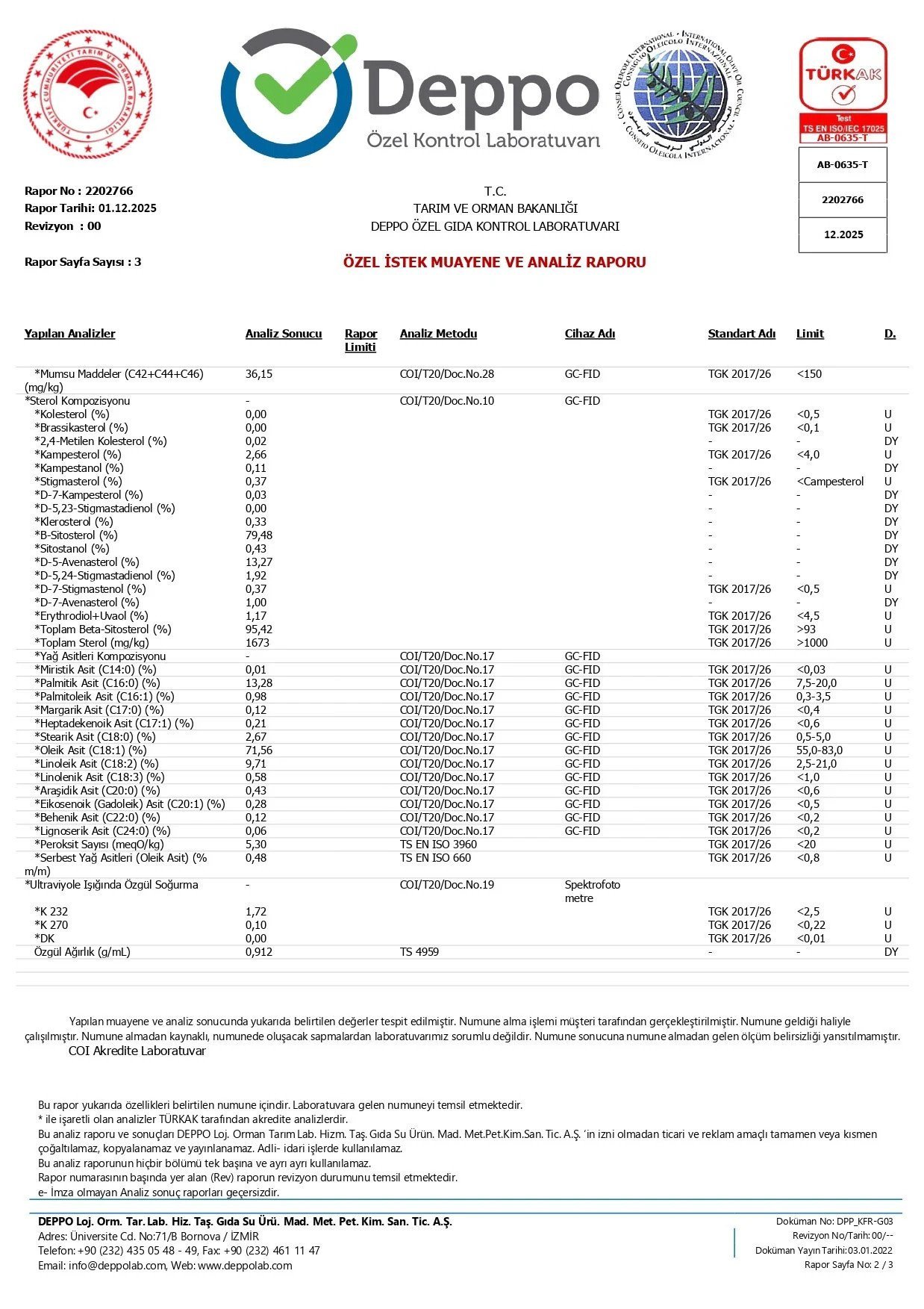 Zeytinyağı Analiz Raporu